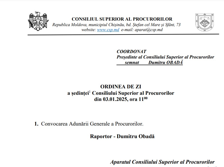 „Din experiența anilor precedenți, Adunarea Generală a Procurorilor a avut loc la 22 decembrie 2023 la Moldexpo. E rezonabil să organizăm acolo evenimentul și în acest an. Data optimă este 11 februarie 2025, ora 10:00”, a menționat președintele CSP, Dumitru Obadă.