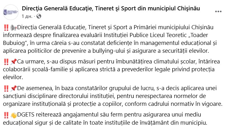DGETS reiterează angajamentul său ferm pentru asigurarea unui mediu educațional sigur și de calitate în toate instituțiile de învățământ din municipiu”, anunță DGETS.