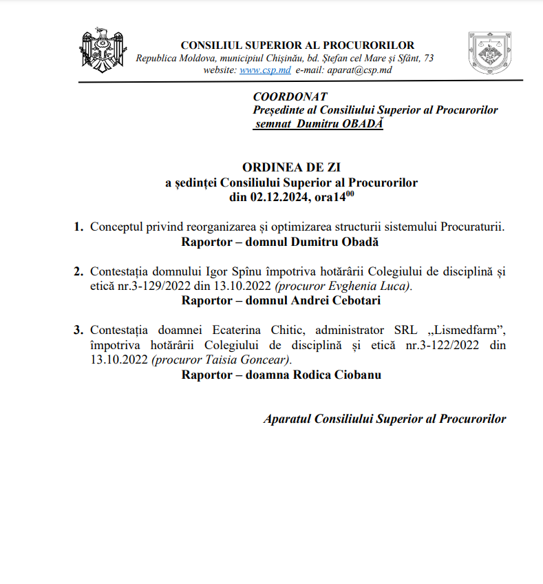 update Plenul CSP examinează, în ședință închisă, contestația domnului Igor Spînu împotriva hotărârii Colegiului de disciplină și etică nr.3-129/2022 din 13.10.2022 (procuror Evghenia Luca).