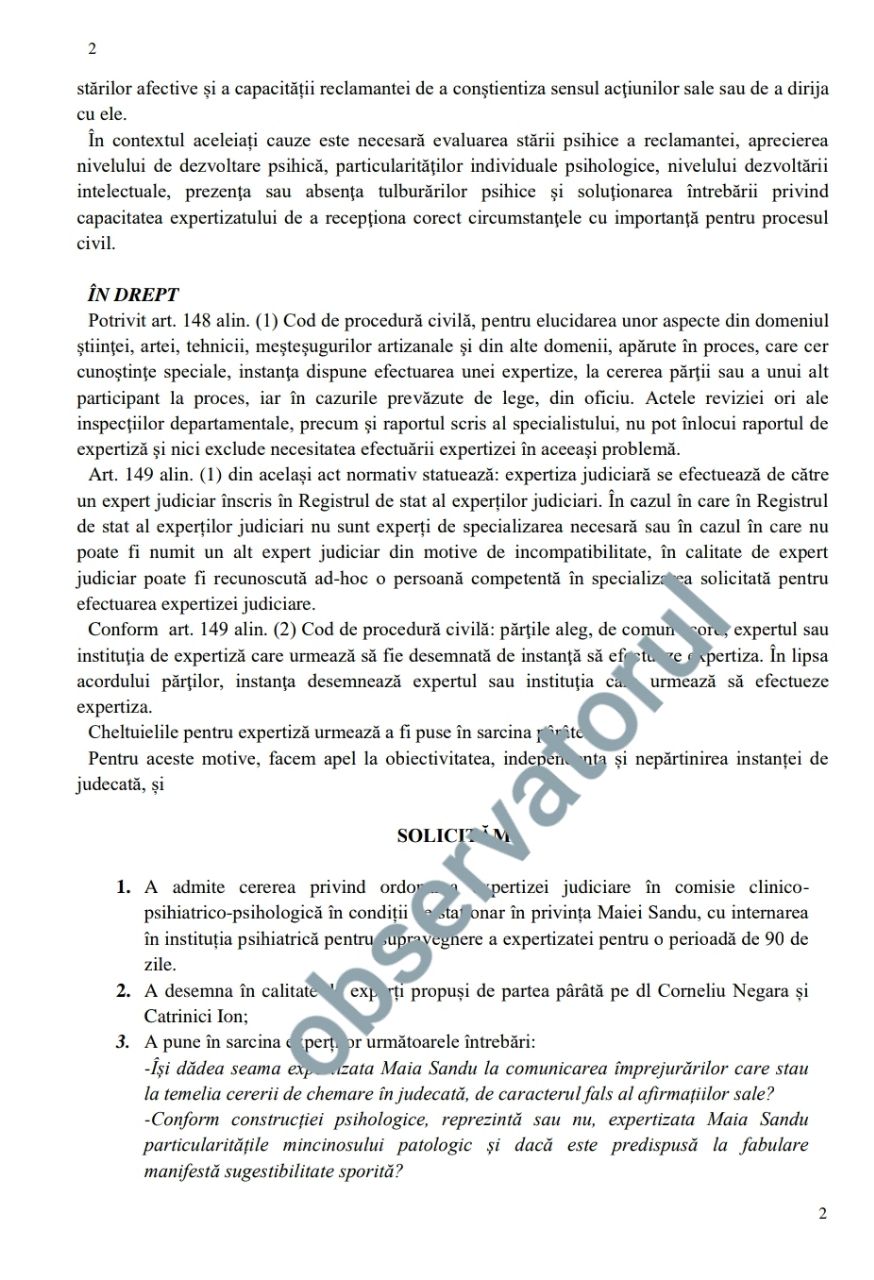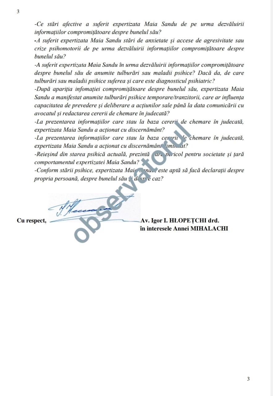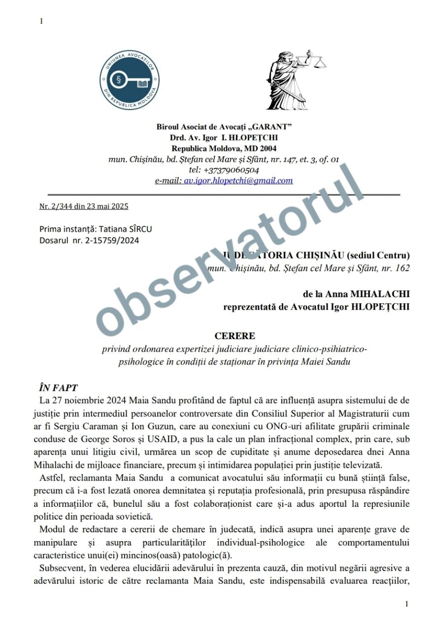 Astfel, potrivit unei cereri semnate de avocatul Igor Hlopețchi, care o reprezintă pe Anna Mihalachi în instanță, în dosarul intentat împotriva acesteia, instanței i se solicită să dispună efectuarea „expertizei judiciare clinico-psihiatric-psihologice în privința Maiei Sandu, „în condiții de staționar”.