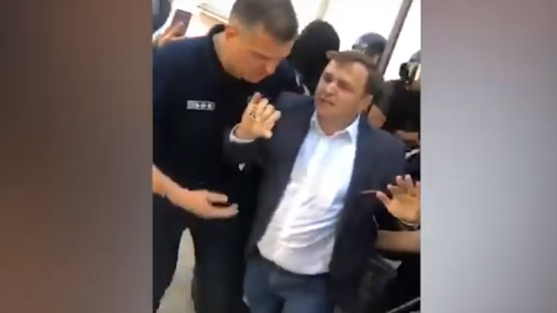Din imagini se observă faptul cum Andrei Năstase încearcă să intre în instituție, însă Alexandru Pînzari ordonează mascaților să nu-i permită.