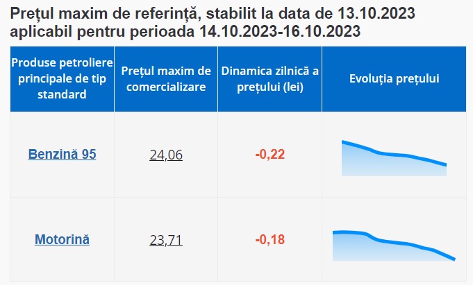 Ieftinirea cumulată a carburanților comparativ cu valorile maximale din luna septembrie a anului curent este de 2,87 lei/litru pentru benzina COR 95 și de 1,11 lei/litru pentru motorina standard, ceea ce reprezintă o diminuare cu 10,65% și, respectiv, 4,47%, proces care continuă și în perioada următoare”, comunică ANRE.