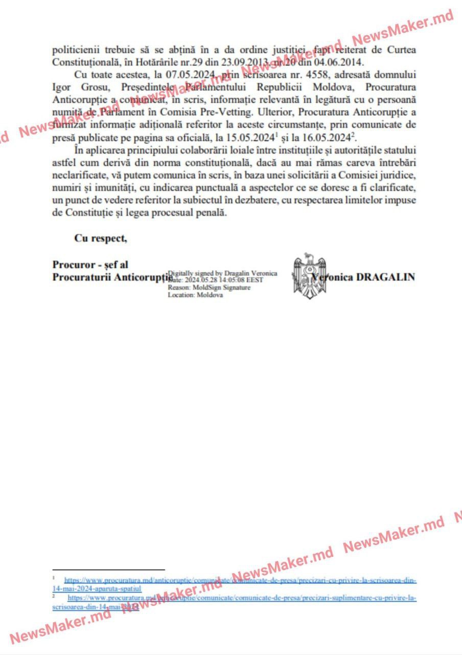 Chemarea și audierea unui procuror de către Comisie contravine rolului și scopului acesteia, neexistând o astfel de obligație juridică pentru procurori și nici vreun raport de subordonare care să justifice o asemenea procedură, ce ar avea conotația unui control de natură politică asupra Procuraturii, care conform Constituției, este o instituție publică autonomă în cadrul autorității judecătorești”, se subliniază în scrisoarea adresată de Veronica Dragalin, președintei Comisiei juridice a Parlamentului, Veronica Roșca