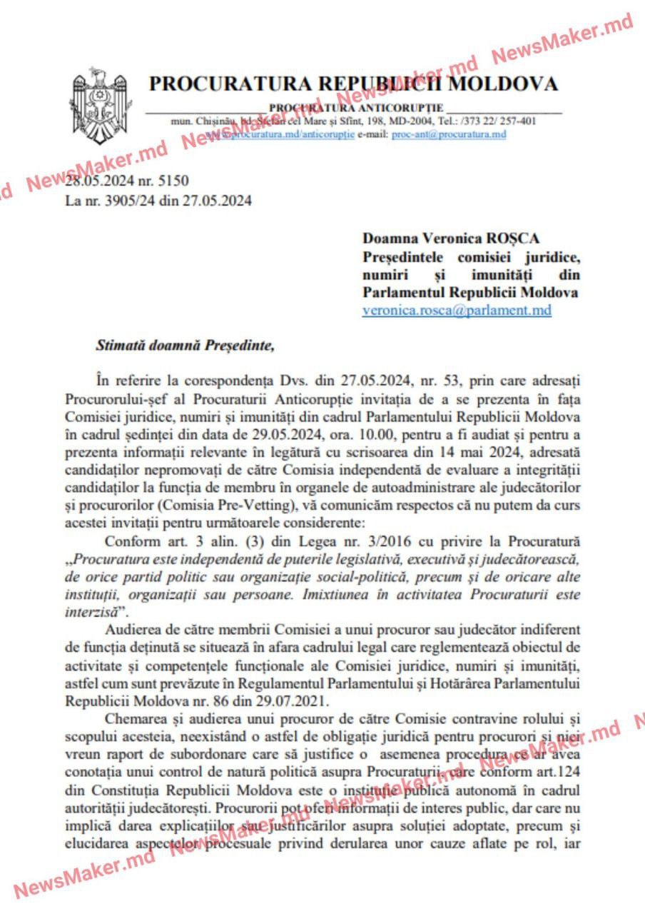 „Vă comunic respectuos că nu pot da curs invitației de a mă prezenta în fața Comisiei Juridice. Procuratura este independentă de puterea legislativă, executivă și judecătorească, de orice partid politic sau organizație social-politică, precum și de alte instituții, organizații sau persoane. Imixtiunea în activitatea Procuraturii este interzisă.