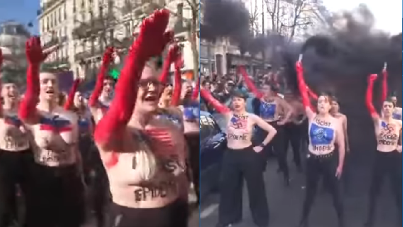 Manifestație vulgară organizată de femeile din Franța pe data de 8 martie. Acestea au ieșit pe stradă cu sânii goi exprimându-și în acest mod dezaprobarea față de administrația americană a lui Donald Trump, dar și față de curentul suveranist în general.