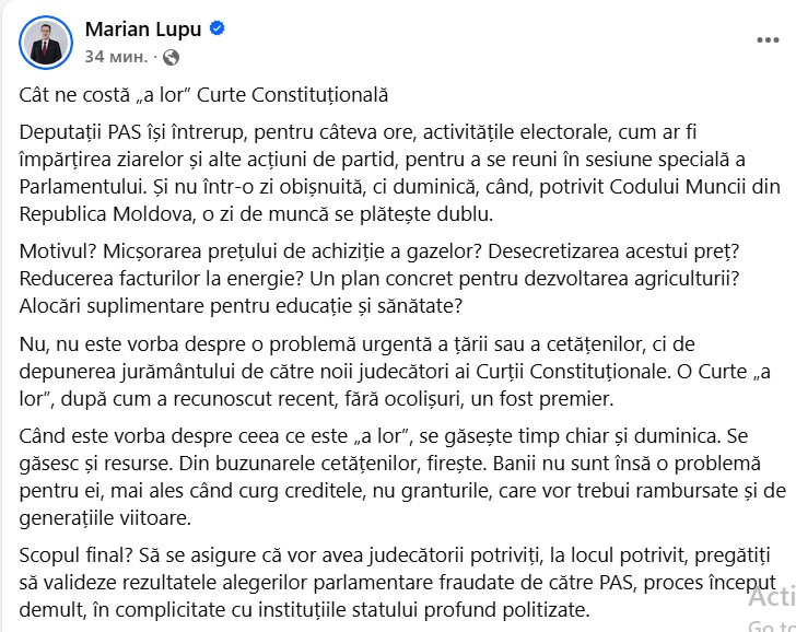 „Deputații PAS își întrerup, pentru câteva ore, activitățile electorale, cum ar fi împărțirea ziarelor și alte acțiuni de partid, pentru a se reuni în sesiune specială a Parlamentului. Și nu într-o zi obișnuită, ci duminică, când, potrivit Codului Muncii din Republica Moldova, o zi de muncă se plătește dublu.