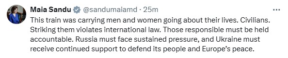 „Acest tren transporta bărbați și femei care își vedeau de viața lor. Civili. Atacarea lor încalcă dreptul internațional. Cei responsabili trebuie trași la răspundere. Rusia trebuie să fie supusă unei presiuni constante, iar Ucraina trebuie să primească sprijin continuu pentru a-și apăra oamenii și pacea Europei”, a scris șefa statului pe X.