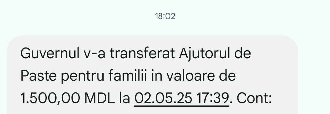 La 23 aprilie, președintele Parlamentului Republicii Moldova, Igor Grosu, și ministrul Muncii și Protecției Sociale, Alexei Buzu, au anunțat că familiile cu un copii cu vârsta de până la 5 ani vor primi un ajutor de Paște de 1500 de lei, iar cele care au la întreținere o persoană cu dizabilități, vor beneficia de o plată unică de 5000 de lei.