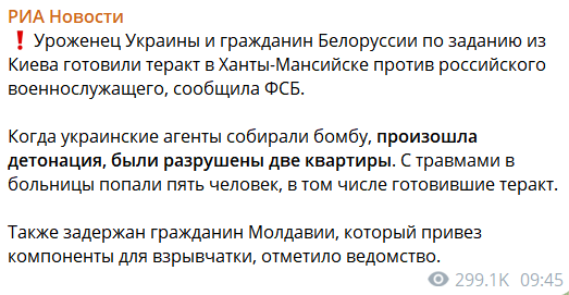 Conform sursei citate, în timp ce agenții ucraineni asamblau bomba, aceasta a detonat și două apartamente au fost distruse. Cinci persoane au fost transportate la spital cu răni, inclusiv cele care pregăteau atacul terorist.