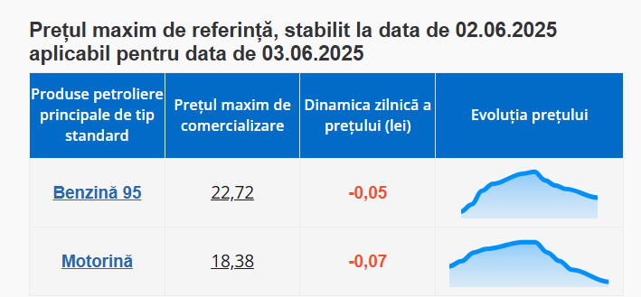 Potrivit prețurilor afișate de ANRE, litrul de benzină va costa mâine - 22,72 lei, iar cel de motorină - 18,38 lei.