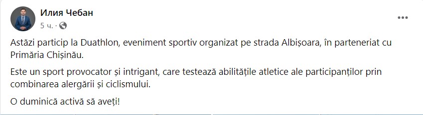 Viceprimarul capitalei, Ilie Ceban, a participat astăzi, 15 octombrie, la evenimentul final al Dniester Cup 2023 - Duathlonul pe Strada Albisoara. „Un sport provocator și intrigant”, a scris Ceban pe rețele.
