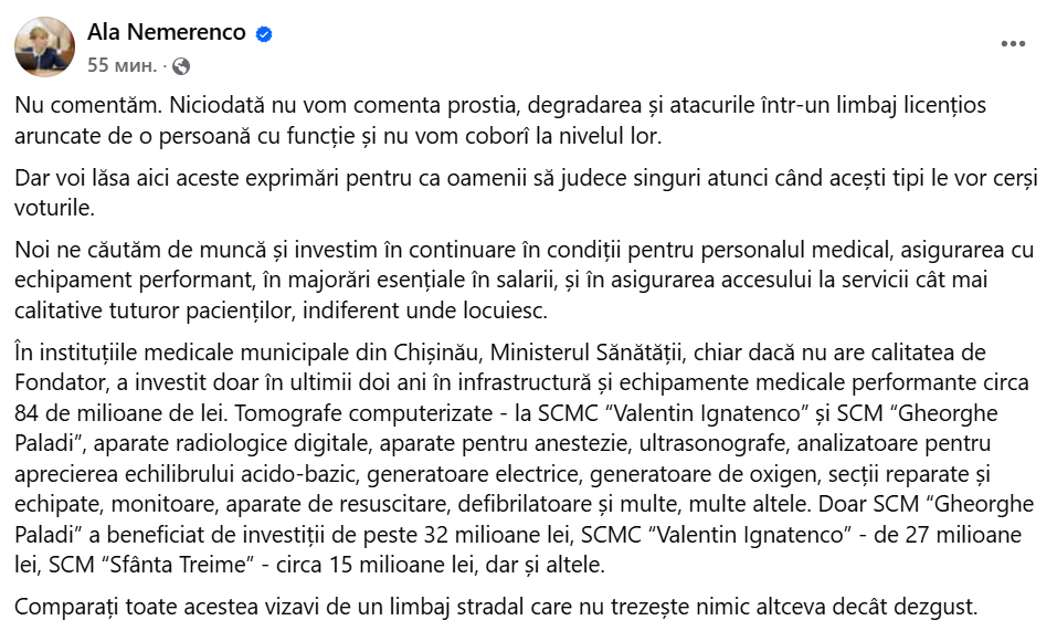 Comparați toate acestea vizavi de un limbaj stradal care nu trezește nimic altceva decât dezgust”, se arată în mesajul Alei Nemerenco.