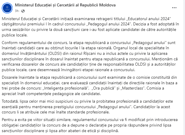 „Ministerul Educației și Cercetării inițiază examinarea retragerii titlului „Educatorul anului 2024” câștigătorului premiului I în cadrul concursului „Pedagogul anului 2024”. Decizia a fost adoptată în urma sesizărilor cu privire la două sancțiuni care i-au fost aplicate candidatei de către autoritățile publice locale”, a adăugat MEC.
