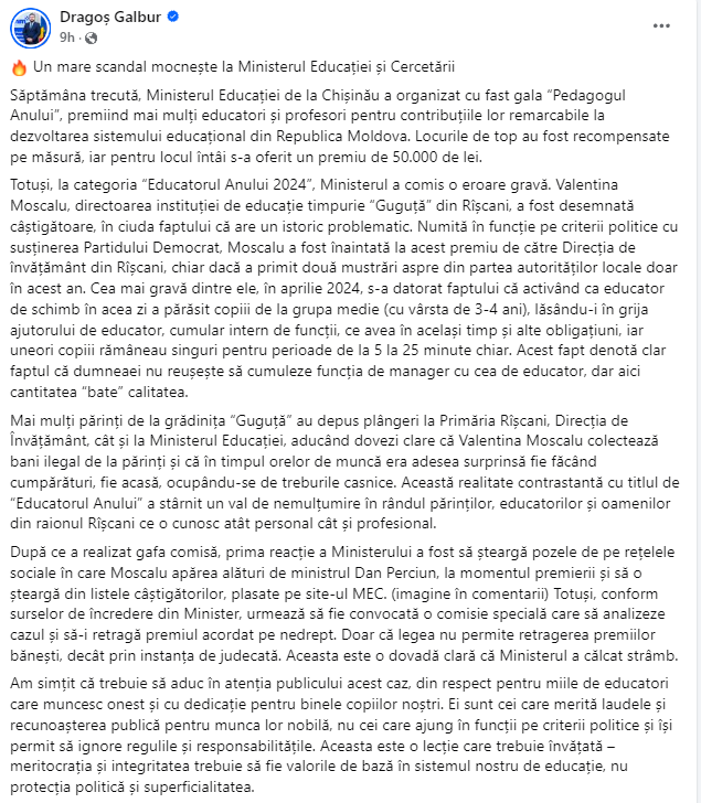 „Totuși, la categoria „Educatorul Anului 2024”, Ministerul a comis o eroare gravă. Valentina Moscalu, directoarea instituției de educație timpurie „Guguță” din Rîșcani, a fost desemnată câștigătoare, în ciuda faptului că are un istoric problematic. Numită în funcție pe criterii politice cu susținerea Partidului Democrat, Moscalu a fost înaintată la acest premiu de către Direcția de învățământ din Rîșcani, chiar dacă a primit două mustrări aspre din partea autorităților locale doar în acest an.