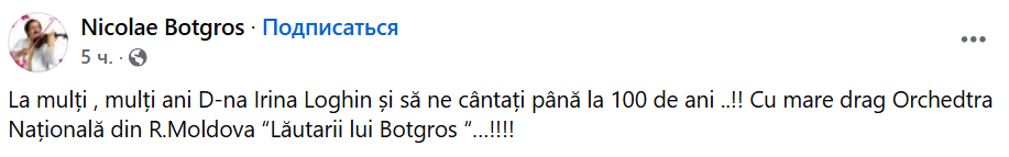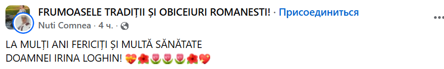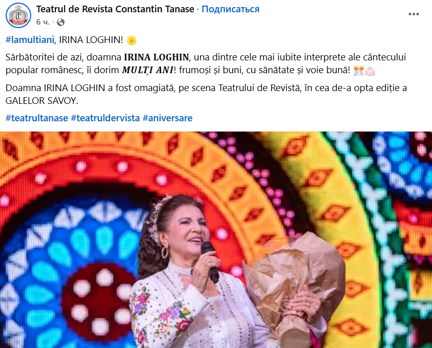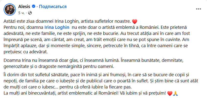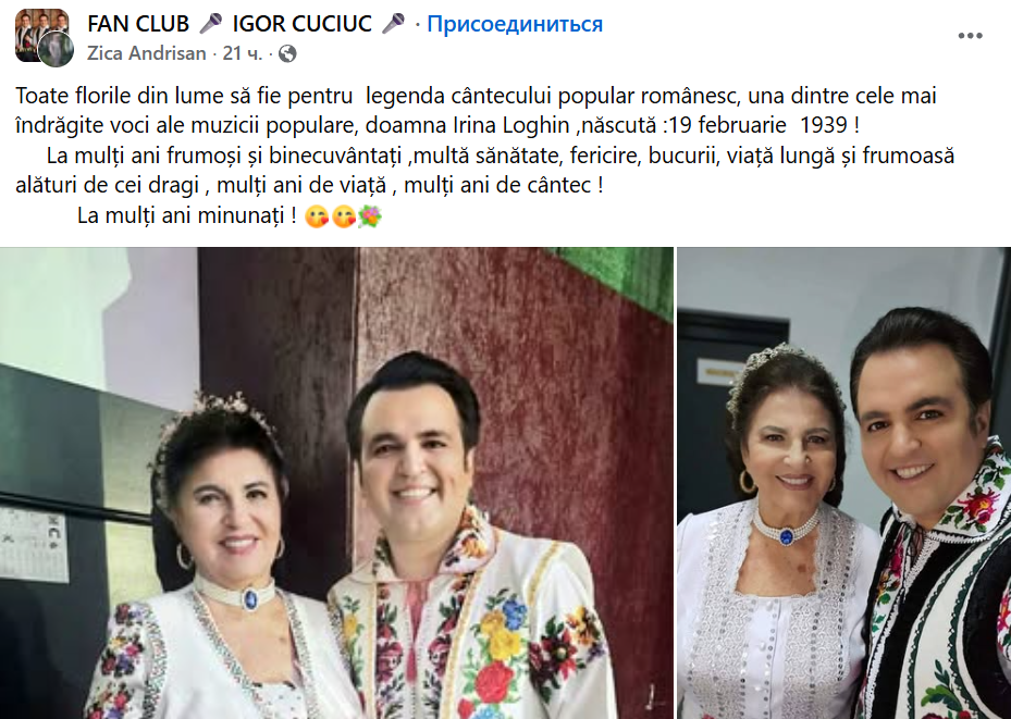 „Astăzi este ziua de naștere a doamnei Irina Loghin! Face o vârstă admirabilă, 87 de ani și eu sunt mândru că de 25 de ani drumurile noastre artistice s-au îngemănat, devenind astfel o mare familie muzicală! Îi doresc sănătate, liniște, bucurii alături de noi și de nepoțica ei minunată!