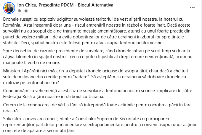 „Dronele rusești cu exploziv ucigător survolează teritoriul de vest al țării noastre, la hotarul cu România. Asta înseamnă doar una - riscul antrenării noastre în război e foarte înalt. Dacă aceste survolări nu au scopul de a ne transmite mesaje amenințătoare, atunci au unul foarte practic din punct de vedere militar - de a evita doborârea lor de către ucraineni în zborul lor spre țintele stabilite. Deci, spațiul nostru este folosit pentru atac asupra teritoriului țării vecine.