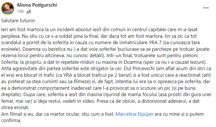 Șoferița, la propriu, a dat în repetate rânduri cu mașina în doamnă (sper că nu i-a cauzat leziuni). Atâta agresivitate din partea șoferiței este strigător la cer. Dn Pincevschi (am aflat acum din știri că el era) era blocat în trafic (că YRA a blocat traficul pe 2 benzi) și a fost unicul care a reacționat (alții au preferat să stea cuminți sau să filmeze) și, de fapt, intenția lui era să o oprească pe șoferiță, dar ea a demonstrat comportament inadecvat care l-a provocat să o scuture un pic (și pe bună dreptate). După care, șoferița a ieșit din masină înjurând de mama focului (așa prostii din gura unei femei, mai rar) și deja restul, vedeți în video. Presa ca de obicei, a distorsionat adevărul, a dat știrea eronat. Am filmat și eu, dar ca martor ocular, știu cum a fost. Marcelina Elpujan era cu mine și o putem confirma”, a menționat în postarea sa Aliona Podgurschi.