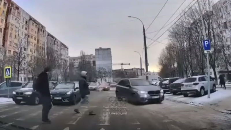 Un moment șocant a fost surprins la Ciocana, unde un șofer de BMW a ieșit la depășire pe contrasens, traversând direct o trecere de pietoni, pe care traversau oameni.