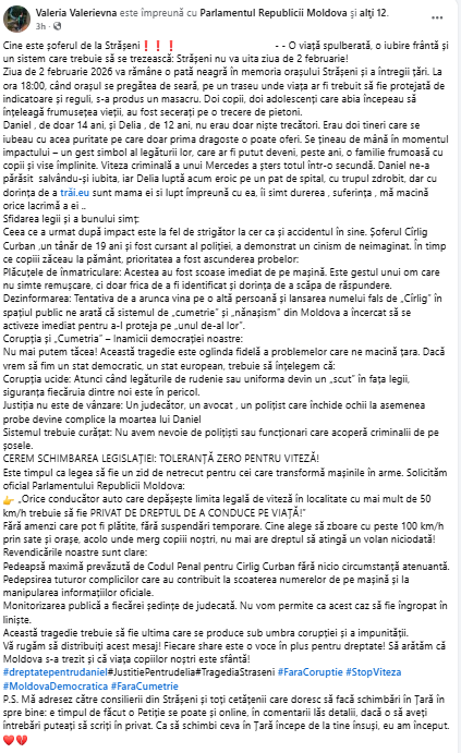 Vă rugăm să distribuiți acest mesaj! Fiecare share este o voce în plus pentru dreptate! Să arătăm că Moldova s-a trezit și că viața copiilor noștri este sfântă”, se arată în mesajul scris de mama fetei.