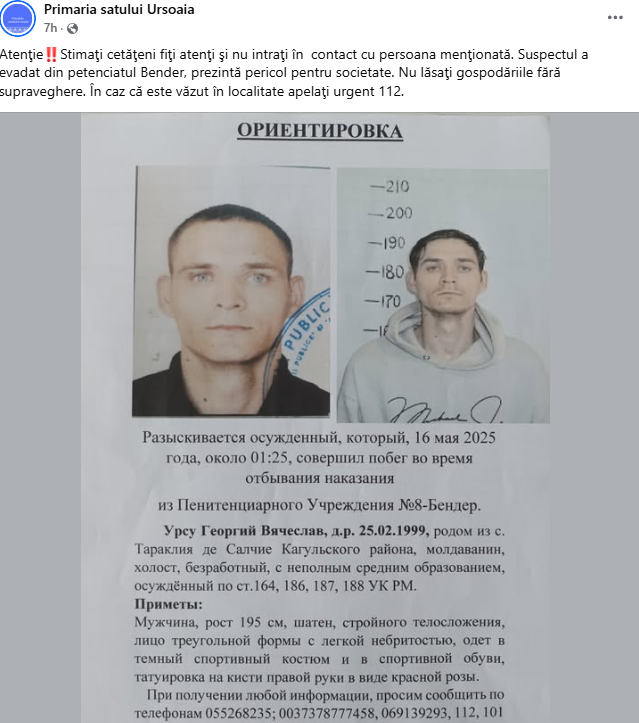 „Stimaţi cetăţeni, fiţi atenţi şi nu intraţi în contact cu persoana menţionată. Suspectul a evadat din penitenciarul Bender, prezintă pericol pentru societate. Nu lăsaţi gospodăriile fără supraveghere. În caz că este văzut în localitate apelaţi urgent 112”, se arată în postare.