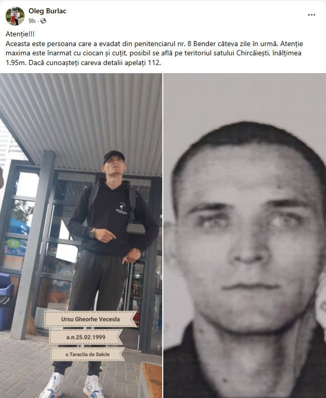 „Aceasta este persoana care a evadat din penitenciarul nr. 8 Bender câteva zile în urmă. Atenție maxima, este înarmat cu ciocan și cuțit, posibil se află pe teritoriul satului Chircăiești, înălțimea 1.95m. Dacă cunoașteți careva detalii apelați 112”, scrie un internaut.