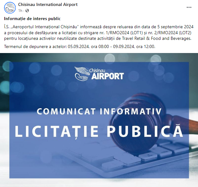„Î.S. ,,Aeroportul Internațional Chișinău” informează despre reluarea din data de 5 septembrie 2024 a procesului de desfășurare a licitației cu strigare nr. 1/RMO2024 (LOT1) și nr. 2/RMO2024 (LOT2) pentru locațiunea activelor neutilizate destinate activității de Travel Retail & Food and Beverages.