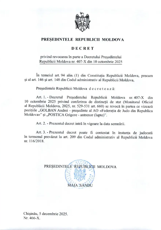 Șefa statului Maia Sandu a semnat un decret prin care au fost revocate distincțiile de stat acordate, acum 2 luni, președintelui Federației de Judo din Republica Moldova, Andrei Golban, și antrenorului Grigore Postica. Decretul a fost semnat pe 5 decembrie și publicat pe pagina oficială a Președinției.