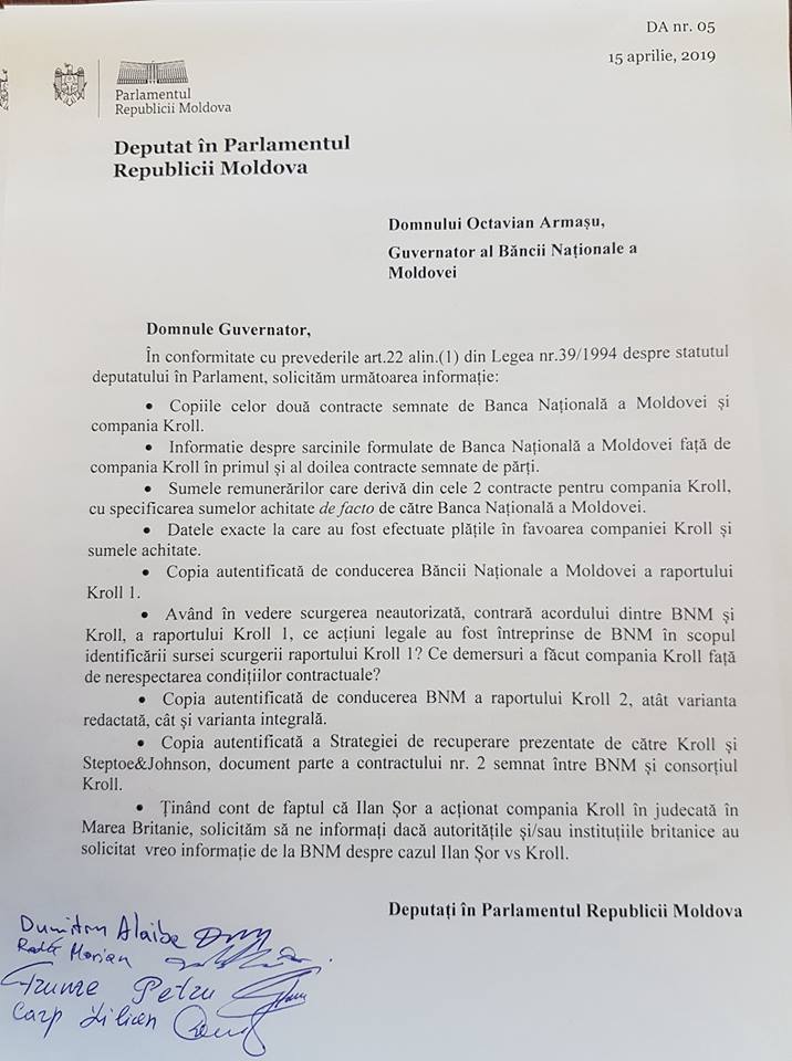 · Ținând cont de faptul că Ilan Șor a acționat compania Kroll în judecată în Marea Britanie, solicităm să ne informați dacă autoritățile și/sau instituțiile britanice au solicitat vreo informație de la BNM despre cazul Ilan Șor vs Kroll”, scrie Dumitru Alaiba.
