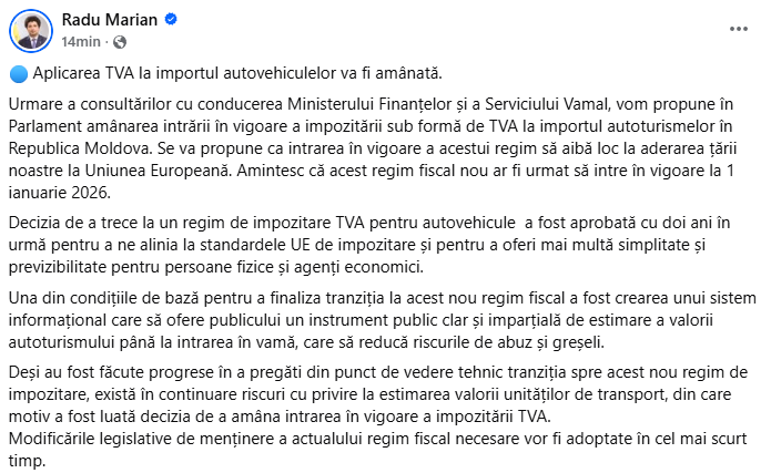 „Urmare a consultărilor cu conducerea Ministerului Finanțelor și a Serviciului Vamal, vom propune în Parlament amânarea intrării în vigoare a impozitării sub formă de TVA la importul autoturismelor în Republica Moldova.