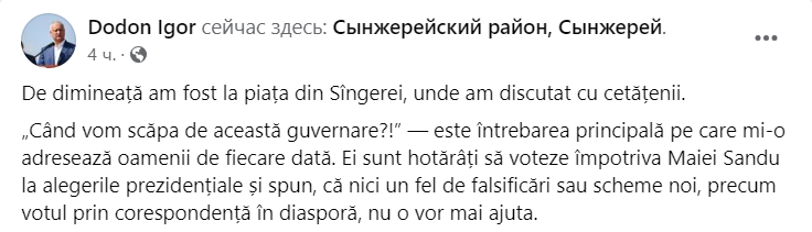 Ei sunt hotărâți să voteze împotriva Maiei Sandu la alegerile prezidențiale și spun, că nici un fel de falsificări sau scheme noi, precum votul prin corespondență în diasporă, nu o vor mai ajuta”, a scris liderul PSRM pe pagina sa de Facebook.