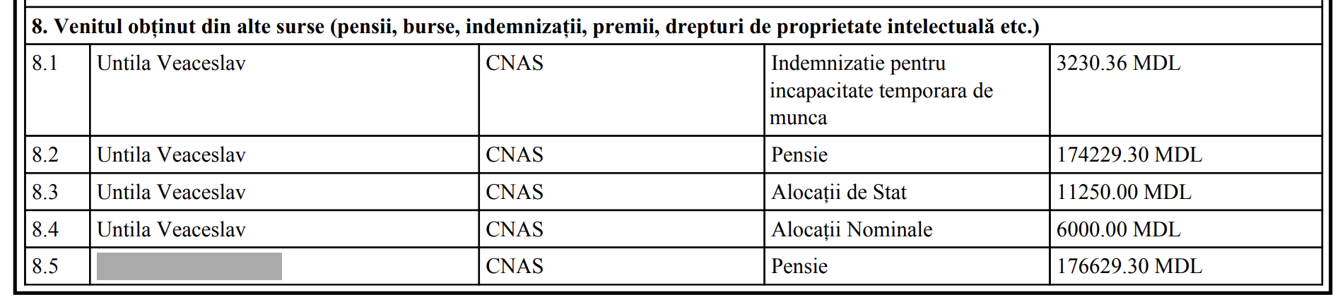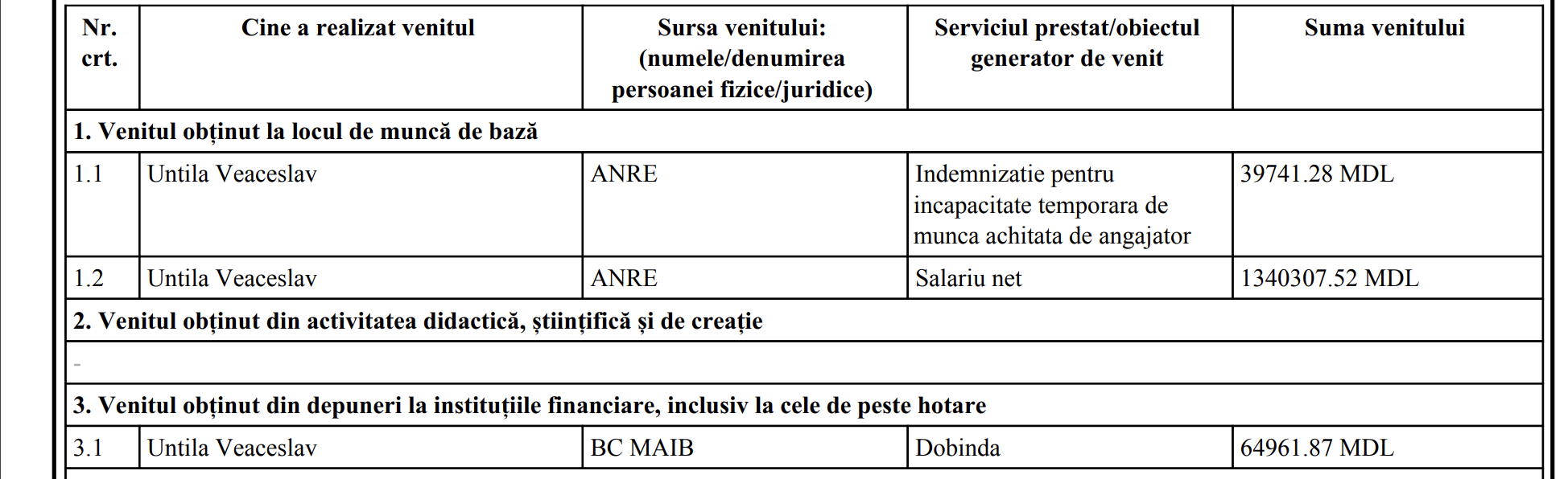 Astfel, conform declarației depuse la ANI, șeful ANRE a încasat o pensie de 174 de mii de lei și peste 64 de mii de lei din depozitele de la o bancă din țară.