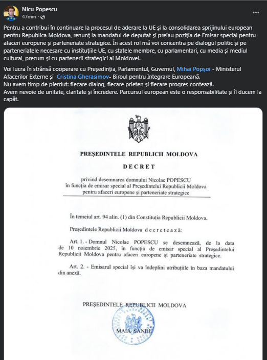 Pe 31 octombrie 2025, președinta Republicii Moldova, Maia Sandu, a semnat decretul privind numirea domnului Nicu Popescu în funcția de emisar special pentru afaceri europene și parteneriate strategice, informeaază reprezentanții Președinției.