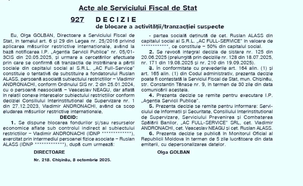 Potrivit deciziei, blocarea vine ca urmare a unei tranzacții suspecte ce implică transmiterea părților sociale dintr-o companie vizată de anchete – „AC Full-Service”.