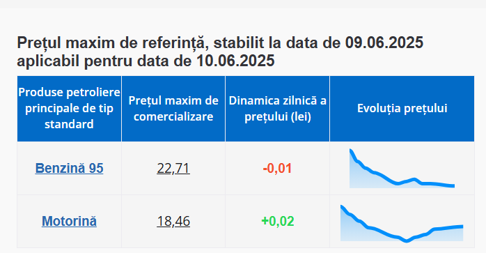 Agenția Națională pentru Reglementare în Energetică (ANRE) a afișat noile prețuri plafon la carburanți pentru mâine, 10 iunie. Astfel, benzina va fi mai ieftină cu un ban, iar prețul motorinei crește cu 2 bani.