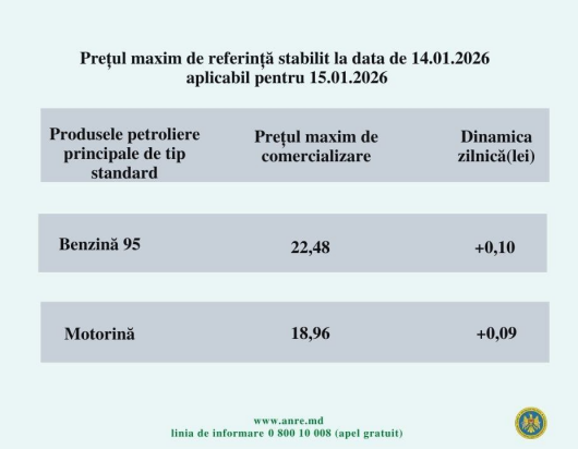 Astfel, litrul de benzină va costa 22,48 lei, iar cel de motorină - 18,96 lei.