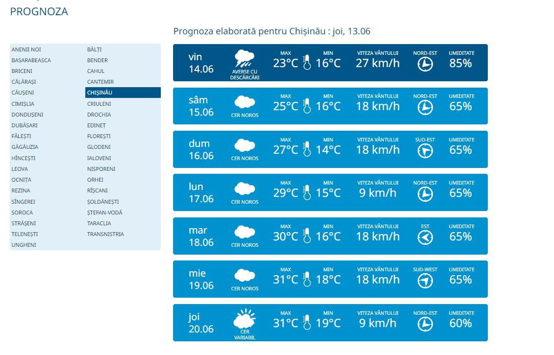 Temperaturile minime vor oscila noaptea între +13..+18°C. Ziua, maximele vor oscila între +20..+25°C.
