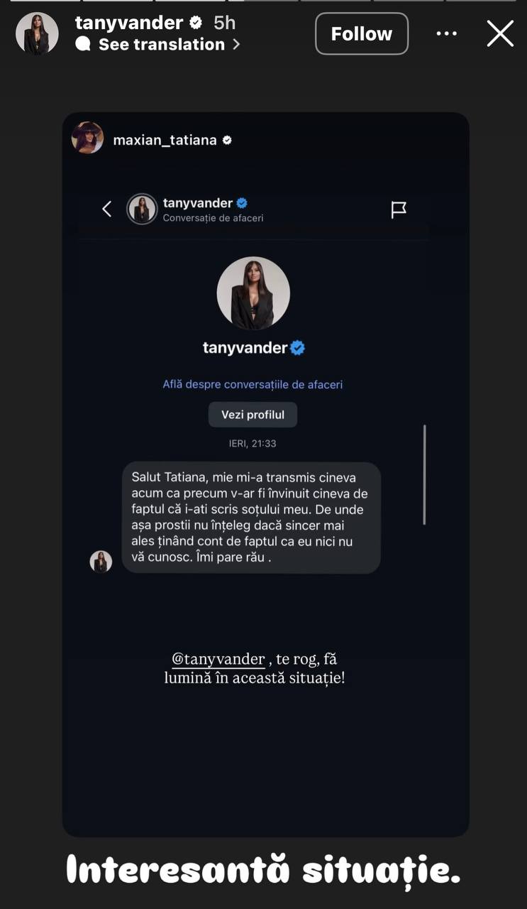 Influencerița a mai menționat că persoana la care s-a referit anterior nu este din Republica Moldova. Totodată, Tany Vander a subliniat că familia Tatianei Maxian este una frumoasă și că aceasta nu are nicio legătură cu situația creată.