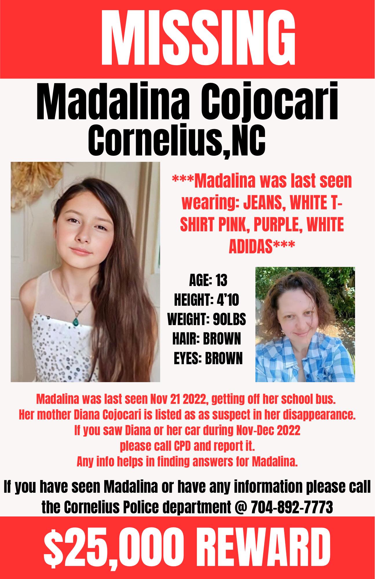 „Fata de 11 ani a fost văzută ultima dată în public pe 21 noiembrie 2022, coborând din autobuzul școlar, lângă casa sa de pe Victoria Bay Drive din Cornelius. Ea a fost dată dispărută pe 15 decembrie 2022.