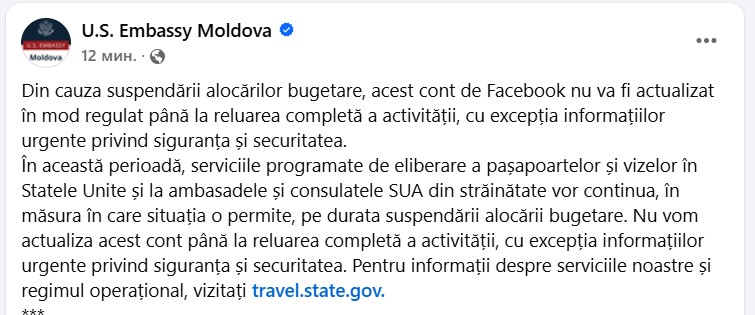 „Din cauza suspendării alocărilor bugetare, contul nu va fi actualizat în mod regulat până la reluarea completă a activității, cu excepția informațiilor urgente privind siguranța și securitatea.