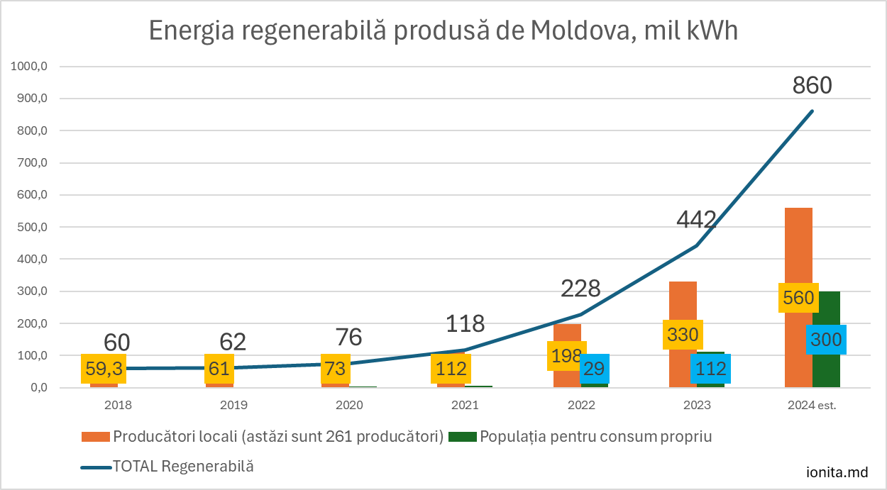 - În 2024, Moldova va produce 860 milioane kWh de energie regenerabilă, echivalentul a 20% din consumul național.