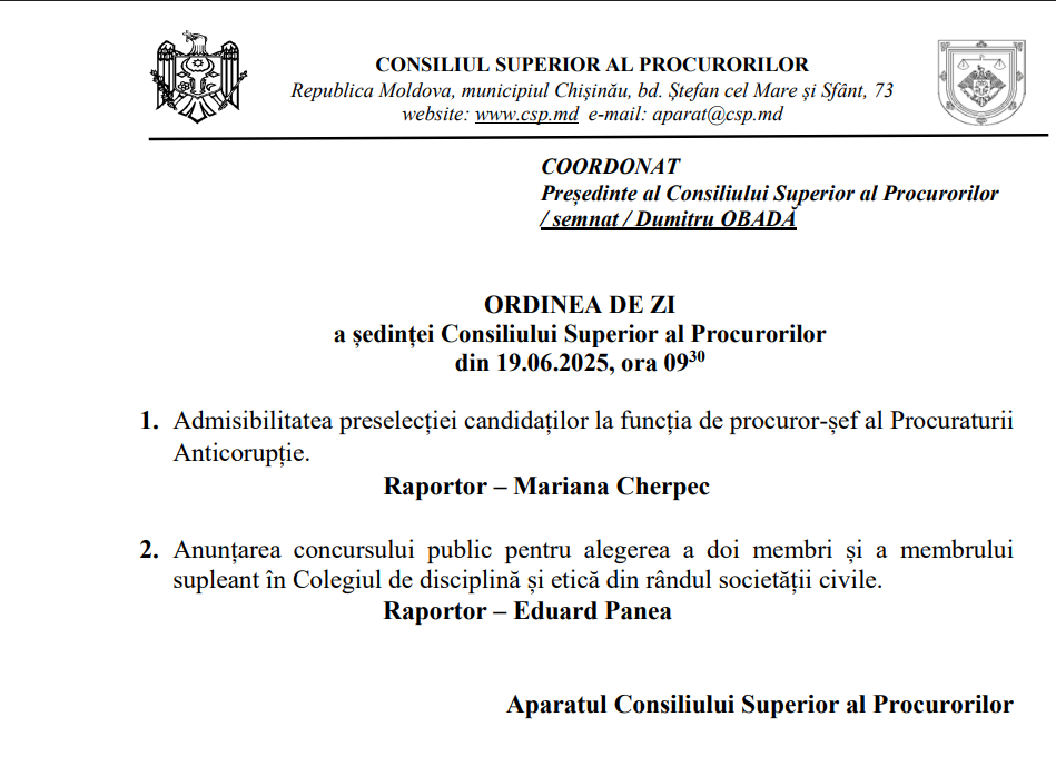 (update) CSP examinează primul subiect de pe agendă și anume admisibilitatea preselecției candidaților la funcția de procuror-șef al Procuraturii Anticorupție. Se întâmplă după ce Comisia specială de preselecție a candidaților la funcția de procuror-șef al Procuraturii Anticorupție a desfășurat etapa a doua a preselecției, și anume cea de intervievare a candidaților desemnați eligibili.