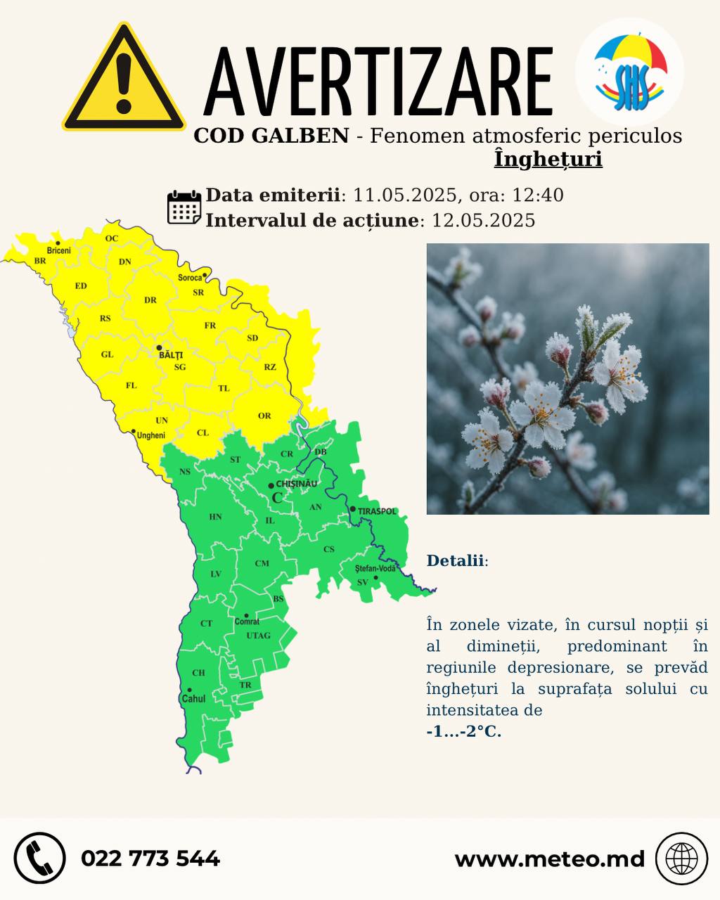 Serviciul Hidrometeorologic de Stat a emis Cod galben de înghețuri, valabil pentru mâine, 12 mai. Alerta este valabilă pentru nordul și centrul țării.