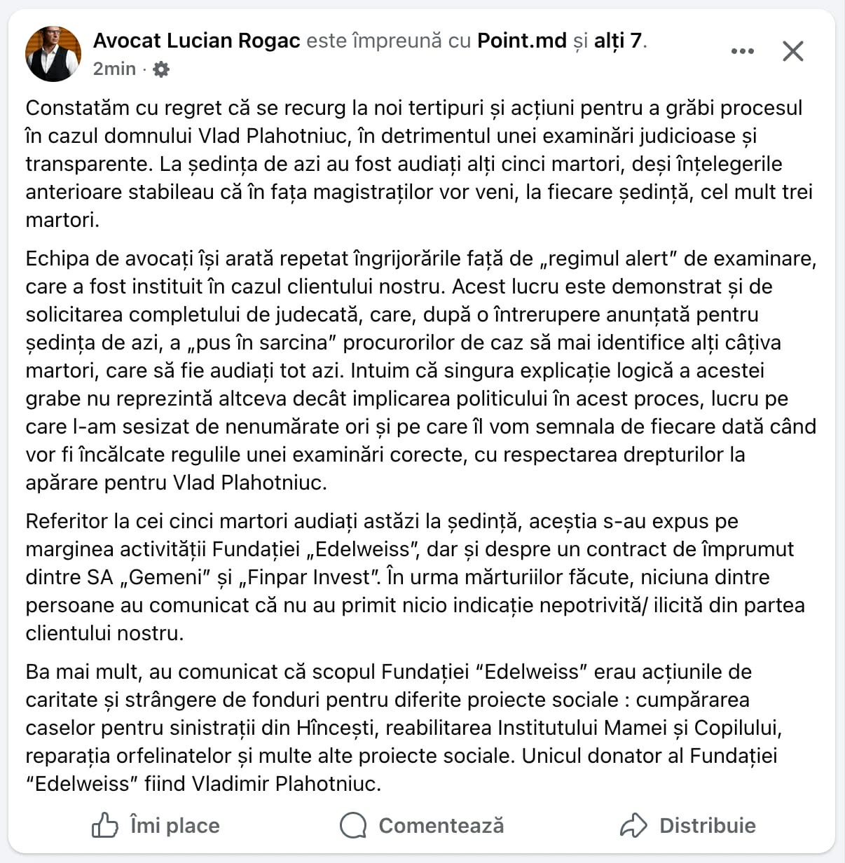 „Constatăm cu regret că se recurg la noi tertipuri și acțiuni pentru a grăbi procesul în cazul domnului Vlad Plahotniuc, în detrimentul unei examinări judicioase și transparente. La ședința de azi au fost audiați alți cinci martori, deși înțelegerile anterioare stabileau că în fața magistraților vor veni, la fiecare ședință, cel mult trei martori. Echipa de avocați își arată repetat îngrijorările față de „regimul alert” de examinare, care a fost instituit în cazul clientului nostru. Acest lucru este demonstrat și de solicitarea completului de judecată, care, după o întrerupere anunțată pentru ședința de azi, a „pus în sarcina” procurorilor de caz să mai identifice alți câțiva martori, care să fie audiați tot azi. Intuim că singura explicație logică a acestei grabe nu reprezintă altceva decât implicarea politicului în acest proces, lucru pe care l-am sesizat de nenumărate ori și pe care îl vom semnala de fiecare dată când vor fi încălcate regulile unei examinări corecte, cu respectarea drepturilor la apărare pentru Vlad Plahotniuc”, a scris Lucian Rogac pe rețelele de socializare.