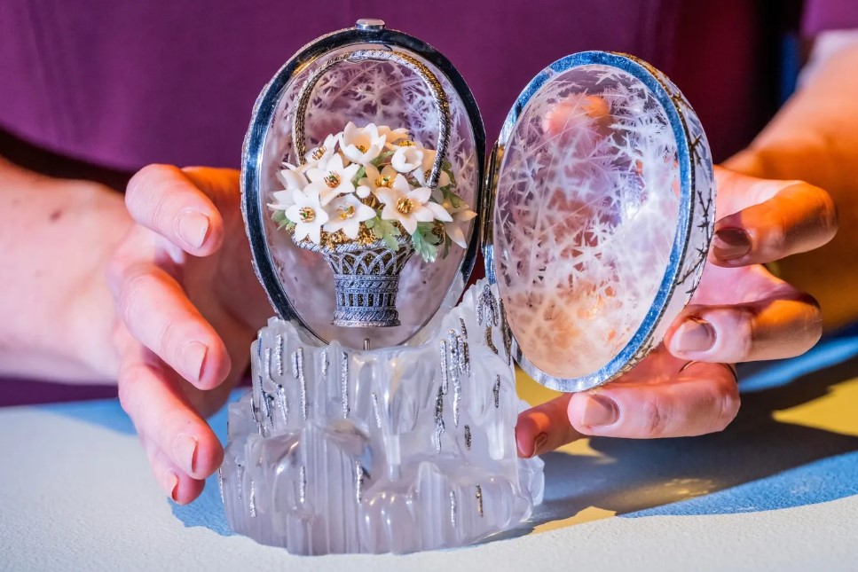 Oul şi soclul său sunt sculptate în cristal de rocă, apoi decorate cu monturi din platină, în formă de fulgi de zăpadă. În interior, o surpriză se oferă privirilor: un buchet de flori compus din anemone din cuarţ alb, fixate pe tulpini din fir de aur într-un coş din platină.