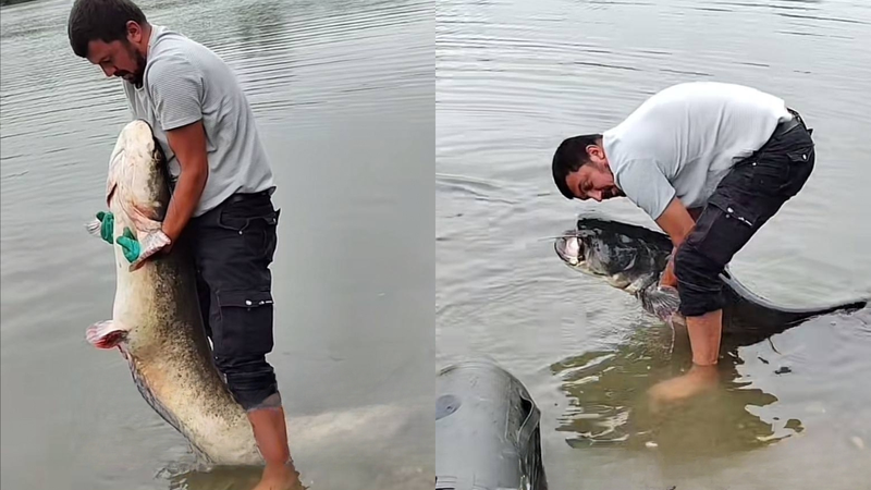 Un moldovean a prins un somn de 210 cm în Franța. Potrivit imaginilor, autorul filmulețului spune că peștele nu a rezistat cântarul.