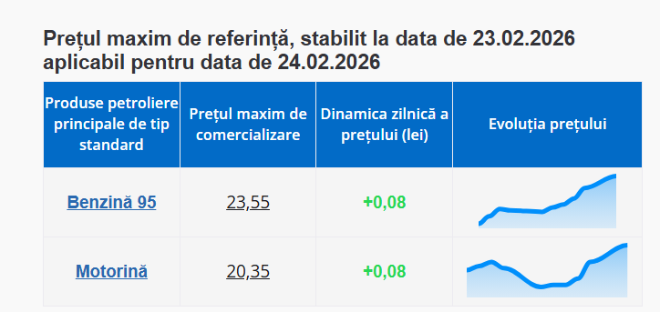 „Agenția Națională pentru Reglementare în Energetică (ANRE) a afișat noile prețuri la carburanți pentru mâine, 24 februarie. Astfel, prețul benzinei și al motorinei va crește cu 8 bani.