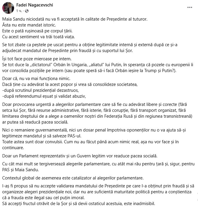 „Maia Sandu niciodată nu va fi acceptată în calitate de Președinte al tuturor. Acesta nu este mandat istoric. Este o pată rușinoasă pe corpul țării. Cu acest sentiment va trăi toată viața.
