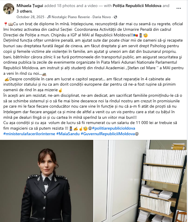 „Cu un braț de diplome în mînă, înțelepciune, recunoștință dar mai cu seamă cu regrete, oficial îmi încetez activatea din cadrul Secției Coordonarea Activității de Urmarire Penală din cadrul Direcției de Poliție a mun. Chişinău a IGP al MAI al Republicii Moldova!!!