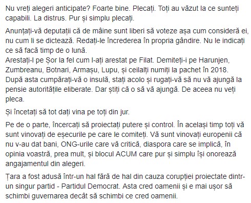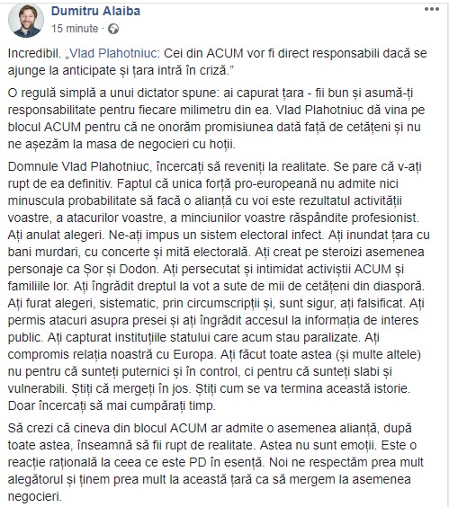 Domnule Vlad Plahotniuc, încercați să reveniți la realitate. Se pare că v-ați rupt de ea definitiv. Faptul că unica forță pro-europeană nu admite nici minuscula probabilitate să facă o alianță cu voi este rezultatul activității voastre, a atacurilor voastre, a minciunilor voastre răspândite profesionist. Ați anulat alegeri. Ne-ați impus un sistem electoral infect. Ați inundat țara cu bani murdari, cu concerte și mită electorală”, a scris deputatul ales din partea blocului ACUM.