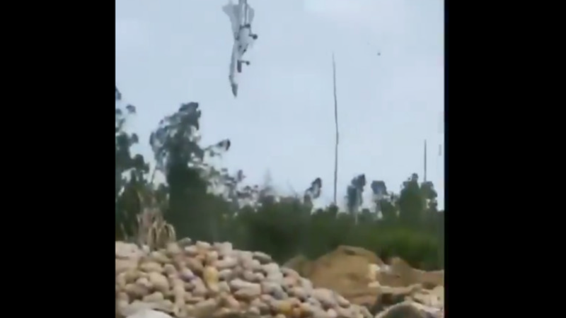 Imaginile distribuite pe reţelele de socializare arată cum avionul militar se prăbuşeşte şi ia foc.